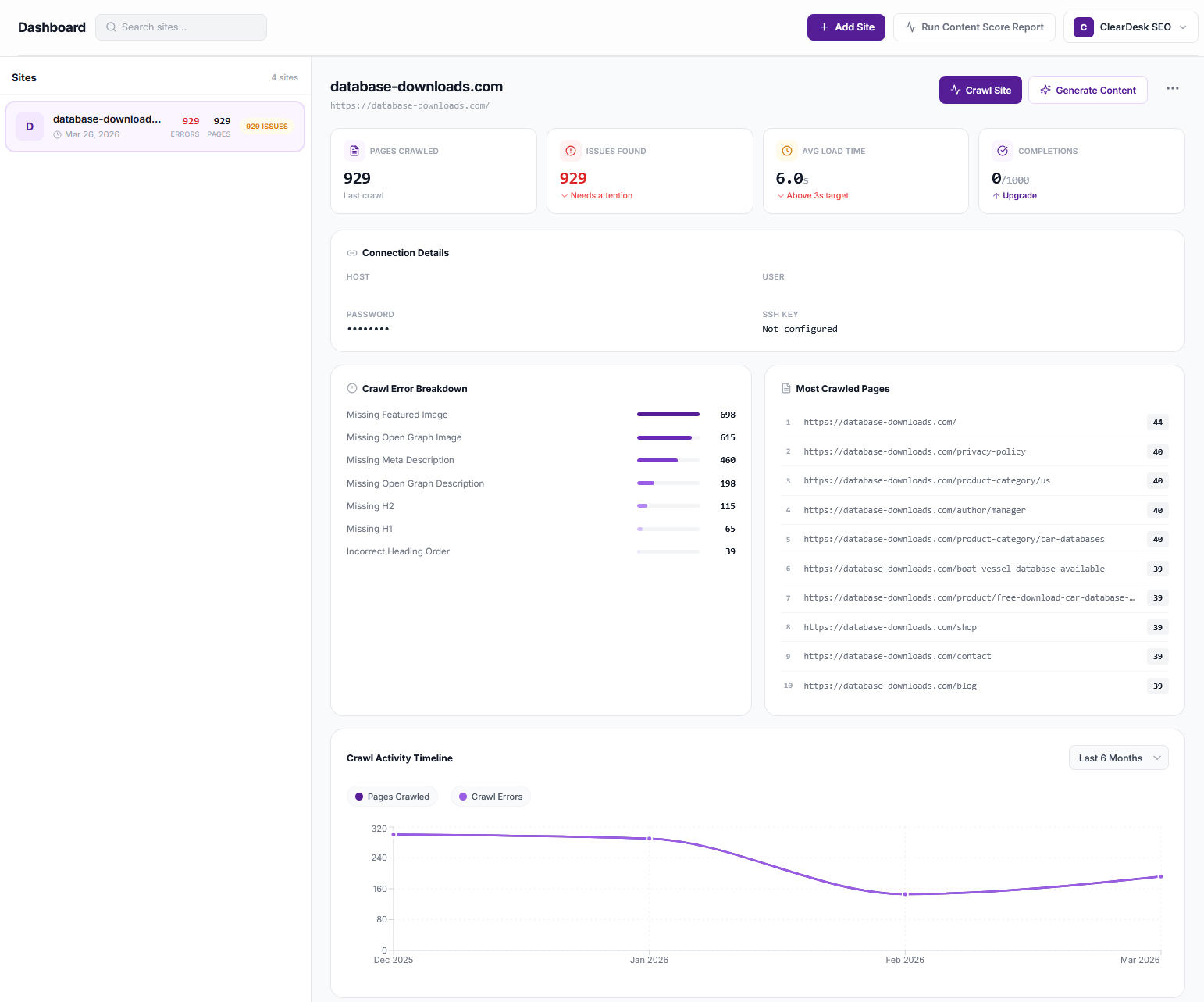 Page speed, duplicate H1s, missing meta tags, heading hierarchy, broken links, HTTP errors — across unlimited sites. Real-time, actionable, prioritized by severity.